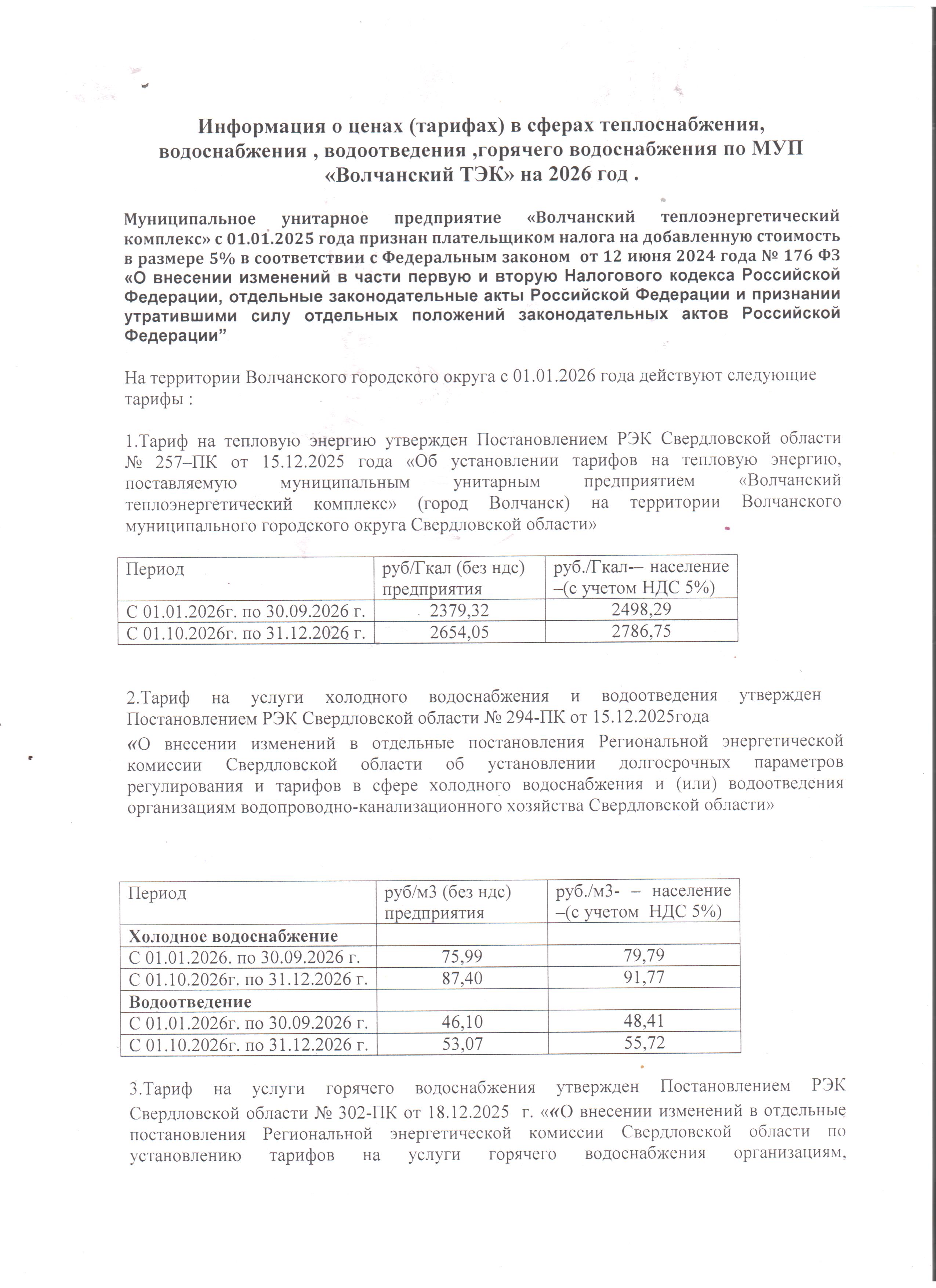 Тарифы | МУП «Волчанский ТЭК»
